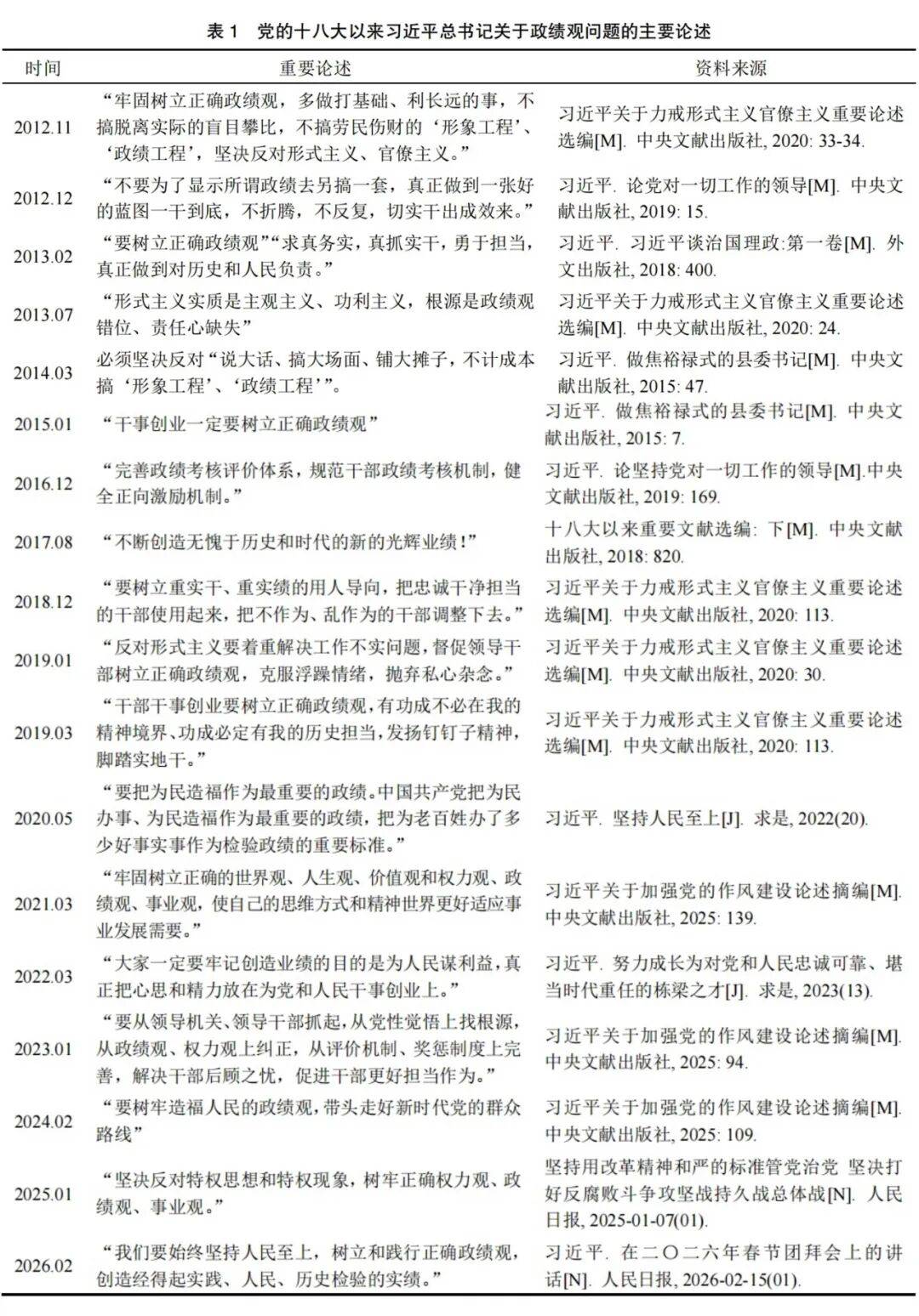 习在浙江任职期间就非常重视政绩问题,他发表过《“潜绩”与“显绩”》《树政绩的根本目的是为人民谋利益》《凡是为民造福的事一定要千方百计办好》等文章,反复强调领导干部必须树立正确政绩观,必须“自觉用最广大人民的根本利益来检验自己的工作和政绩,做到凡是为民造福的事就一定要千方百计办好,凡是损害广大群众利益的事就坚决不办”[4]33。中国特色社会主义进入新时代,坚持什么样的政绩观被摆上更加重要的位置。 党的十八大闭幕的第二天,习就提出树立正确政绩观的问题。11月15日,他在党的十八届一中全会上发表重要讲话,指出要“牢固树立正确政绩观,多做打基础、利长远的事,不搞脱离实际的盲目攀比,不搞劳民伤财的‘形象工程’、‘政绩工程’,坚决反对、官僚主义”[5]33-34。在坚持和发展中国特色社会主义事业的新时代实践中,习反复提出和强调必须树立和践行正确政绩观,论述非常多(见表1),从不同角度提出的重要观点,为树立和践行正确政绩观提供了思想指南,确立了行动纲领。