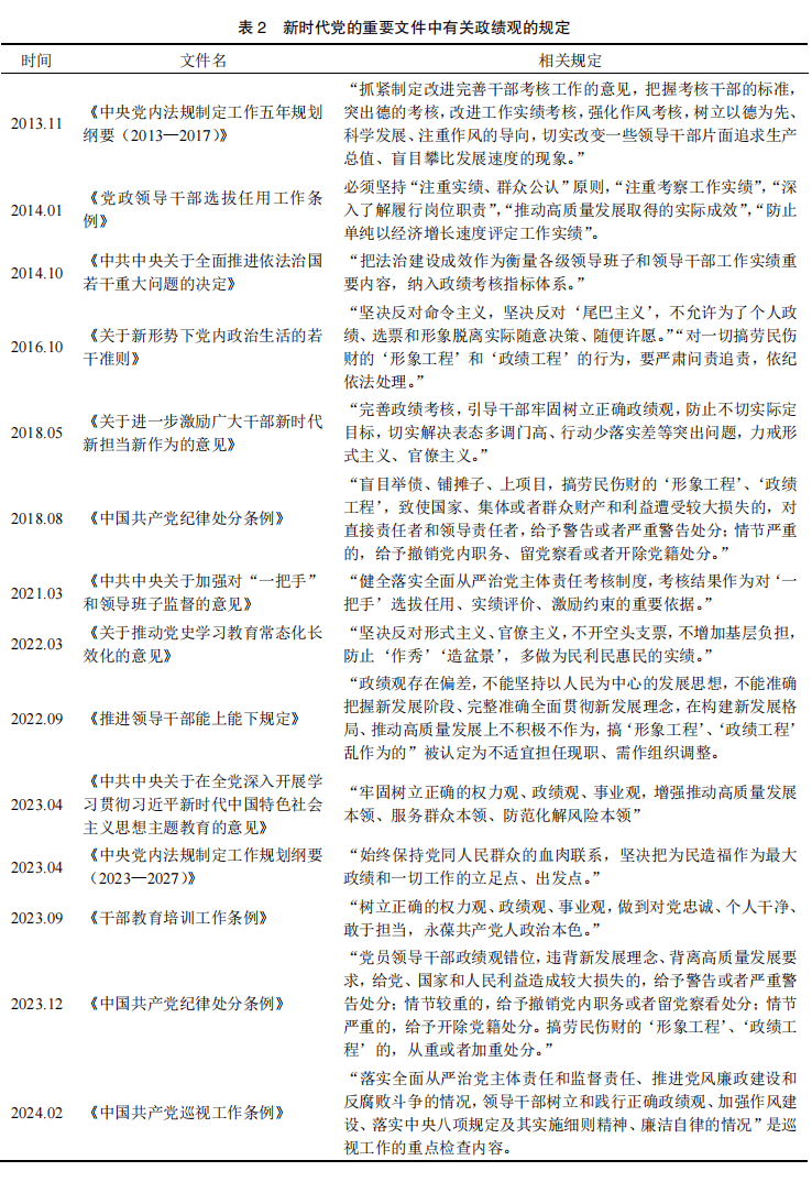 新时代习的相关重要论述以及党的规定,坚持守正创新,在创新治国理政的实践中不断深化对政绩观问题的认识。树立和践行正确政绩观被拓展到世界观、人生观、价值观的改造,权力观、事业观、利益观的端正,党性淬炼的要求,领导干部从严管理的实践,党内法规和政策的制定,干部干事担当作为的责任,巡视工作的内容等各个方面,意识不断强化,理论日益丰富,实践更加自觉。在坚持和发展新时代中国特色社会主义的实践中,以树立和践行正确政绩观迈出前进步伐,为赢得广大人民群众对中国全面领导的信任拥护、巩固党长期执政的地位夯实了基础。