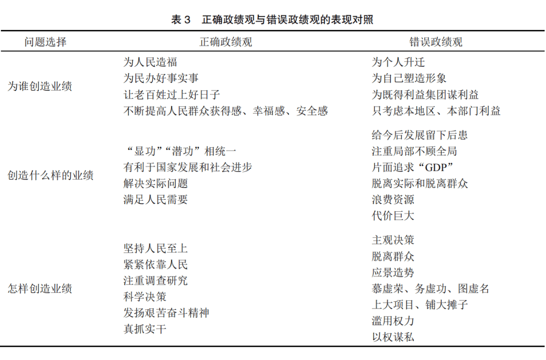 正确政绩观与错误政绩观泾渭分明,在实践中呈现两种面相(见表3),形成截然不同的行动逻辑,对领导干部干事作为产生正负两方面的影响。正确政绩观的核心要义可以从以下三个方面加以把握。其一,坚持人民至上,以“为民造福是最大政绩”坚定“为谁创造业绩”的政治立场,以人民满意作为创造政绩的根本追求。其二,坚持党性原则,以贯彻党中央集中统一领导为恪守“创造什么样的业绩”的实践遵循,以服从大局、长远和整体利益作为创造政绩的行为取向。其三,坚持为民办实事好事,以求真务实精神形成“怎样创造业绩”的正确方法,以科学精神作为创造政绩的力量支撑。习指出,“中国把为民办事、为民造福作为最重要的政绩,把为老百姓办了多少好事实事作为检验政绩的重要标准”[6]55,“一定要树立大局观、长远观、整体观,不能因小失大、顾此失彼、寅吃卯粮、急功近利”[7]434,必须“讲真话、察真情、报真数,谋实招、办实事、求实效,追求实实在在的发展、没有水分的发展、速度质量效益相统一的发展,努力创造出经得起实践、人民、历史检验的成绩”[5]57-58。这些重要论述贯彻党全心全意为人民服务的根本宗旨,体现党为中国人民谋幸福和为中华民族谋复兴的初心使命,为树立和践行正确政绩观提供了鲜明的导向。