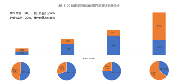 考虑到豪华品牌整体参与者并不多,为乐给大家看到更加全面的画面,此处将特斯拉一并纳入,进行分析。2015年至今,上市的新能源车型共有23款,其中纯电动汽车产品3款,累计销量47459辆,占比54%。插电混动车型共有20款,累计销量39475,占比46%。
