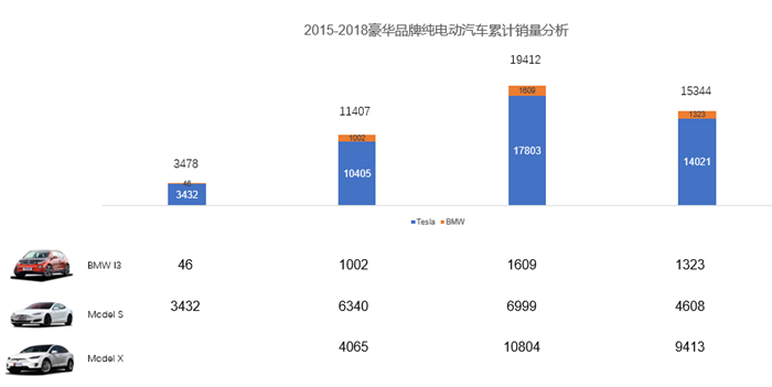 2015年至今,豪华品牌纯电动汽车只有三款车型,分别是宝马i3、特斯拉的Model S和Model X。其中,宝马i3累计销量3980台,Model S累计销量21379,Model X累计销量24282台。