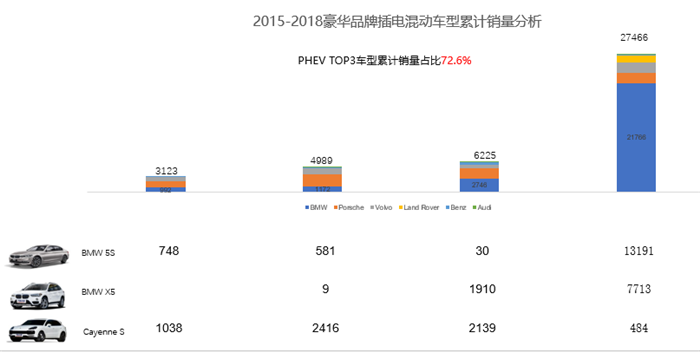 2015年至今,豪华品牌插电混动车型共有20款车型,累计销量排名前三的车型分别是宝马5系混动、宝马X1混动和卡宴S混动,累计销量占比高达72.6%。2018年,宝马5系插电混动销量突破1万台,2015年至今,累计销量14550台,独占鳌头。