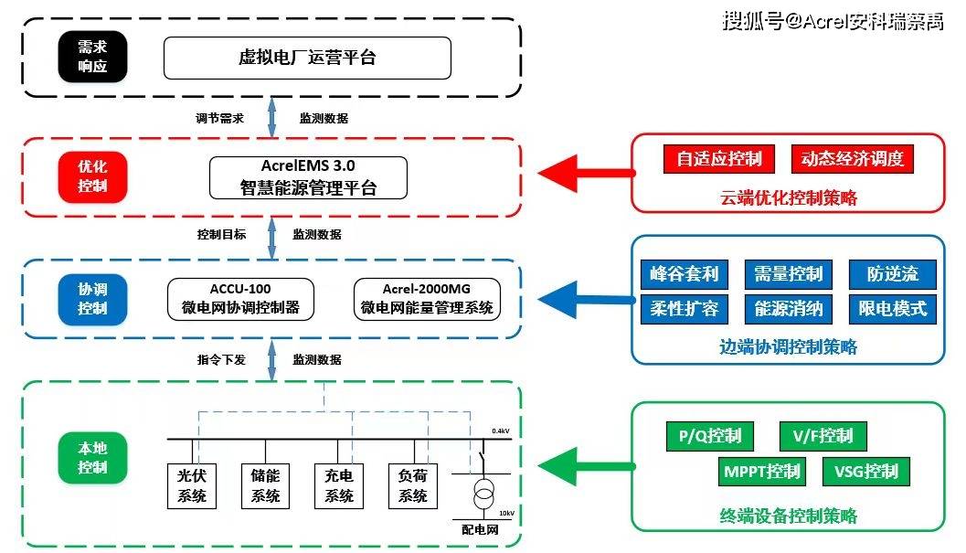 对微电网的源、网、荷、储能系统、充电负荷进行实时监控、诊断告警、全景分析、有序管理与高级控制,实现微电网运行监视全面化、安全分析智能化、调整控制前瞻化、全景分析动态化,推动光储充资源灵活互动与经济优化运行,最大化能源效益、经济效益与环境效益。
